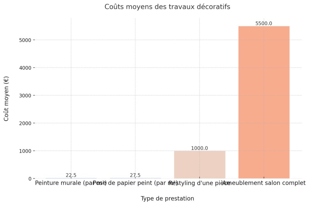 Le prix des travaux de décoration varie considérablement selon le type d’intervention. Pour la peinture, comptez entre 15 et 30€/m² pour une prestation réalisée par un artisan, fournitures comprises. Le restyling d’une pièce par un décorateur professionnel se situe généralement entre 500 et 1500€, tandis que l’ameublement complet d’un salon peut atteindre 3000 à 8000€ selon la gamme choisie.